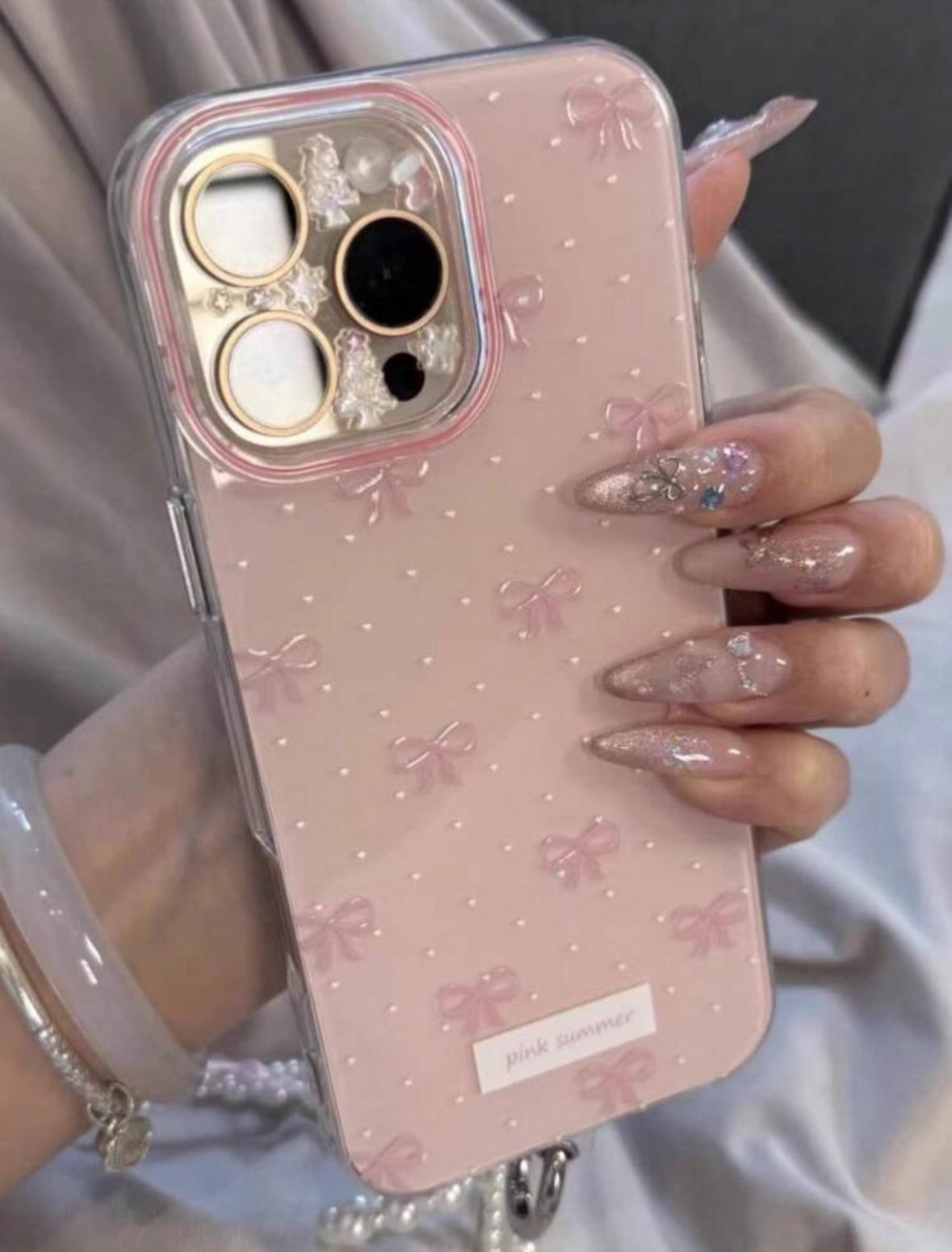 This pink bow case with a pearl pendant adds a touch of luxury while keeping your phone protected in style.