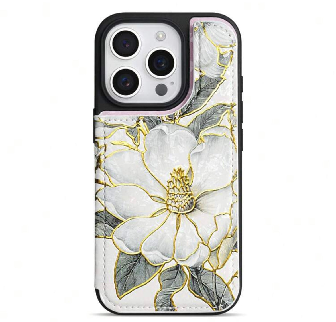 The Magnolia Wallet Case blends beauty and practicality with floral foil embossing, RFID blocking, double buckle security, card slots, a photo frame, and a convenient magnetic flip design.